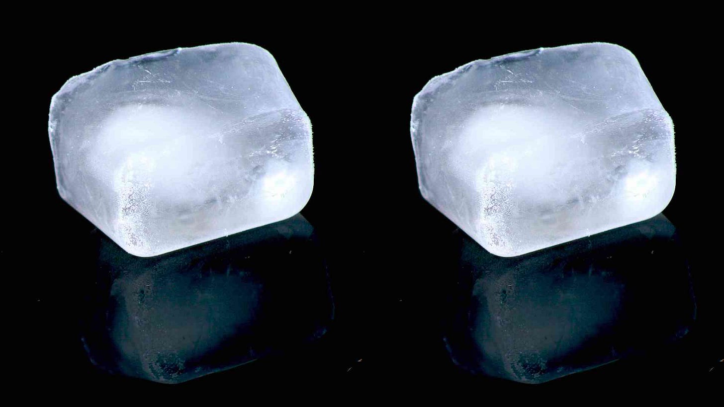 It’s totally up to you, but you may want to position the ice cubes so that they are about as far apart as a set of human eyes. If they are standard, tray-style ice cubes they will perhaps suggest the lenses of a pair of eyeglasses. Note the cloudy eye floating within the center of each lens. These are clusters of air bubbles and dissolved minerals suspended in the water and trapped in position during the freezing process.